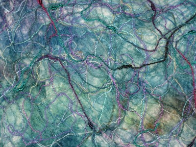 The class focuses on using fabric, paper, paint, and all sorts of embellishments to create fabric for other projects. We’ve used tissue paper, pattern paper, paper towels, mulberry bark, paper bags, and silk hankies (unspun silk) to make fabric to use for a vase, little books, a box, and a portfolio. The class has given me the confidence to try some materials I have read about.